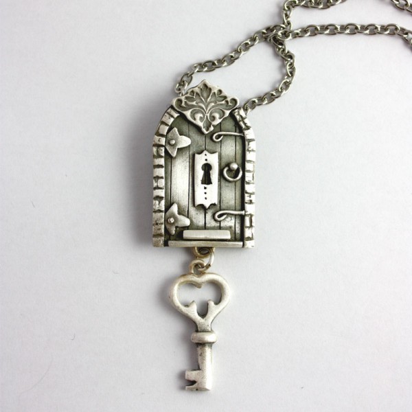 Whimsical door and key pendant in pure silver. This pendant is hand built piece by piece, and uniquely designed by JB collections. This piece comes on a long stainless steel chain made to order may differ slightly from the photo